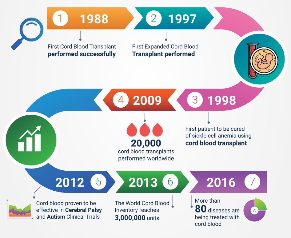 The infographic below gives a quick snapshot of how cord blood banking has evolved since the first transplant was performed successfully in 1988.